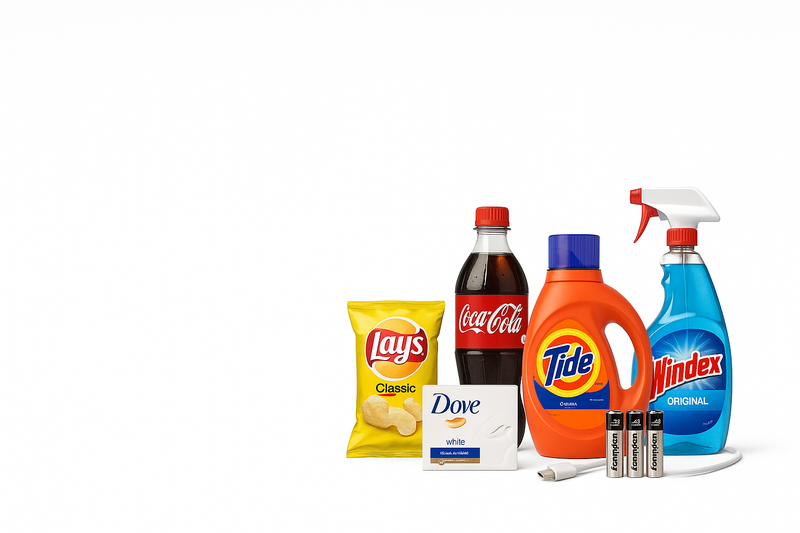 Snacks, drinks, essentials, pet supplies, chargers, cleaning items & more.